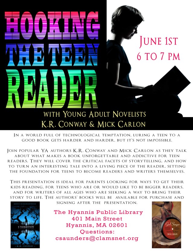 On June 1st at the Hyannis Library, I’m teaching Hooking the Teen Reader with Mick Carlon. We are going to talk about how we draw the reader into our stories, as well as our favorite, un-put-downable reads. Our books will also be available for purchase and for us to sign after the event.