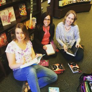 Authors Jen Brooks, Lori Goldstein, and Trisha Leaver signing stock at Barnes and Noble.