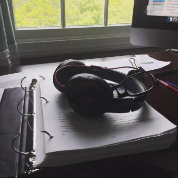 100,000 words in manuscript form with a pair of Beats headphones on K.R. Conway’s desk on Cape Cod.