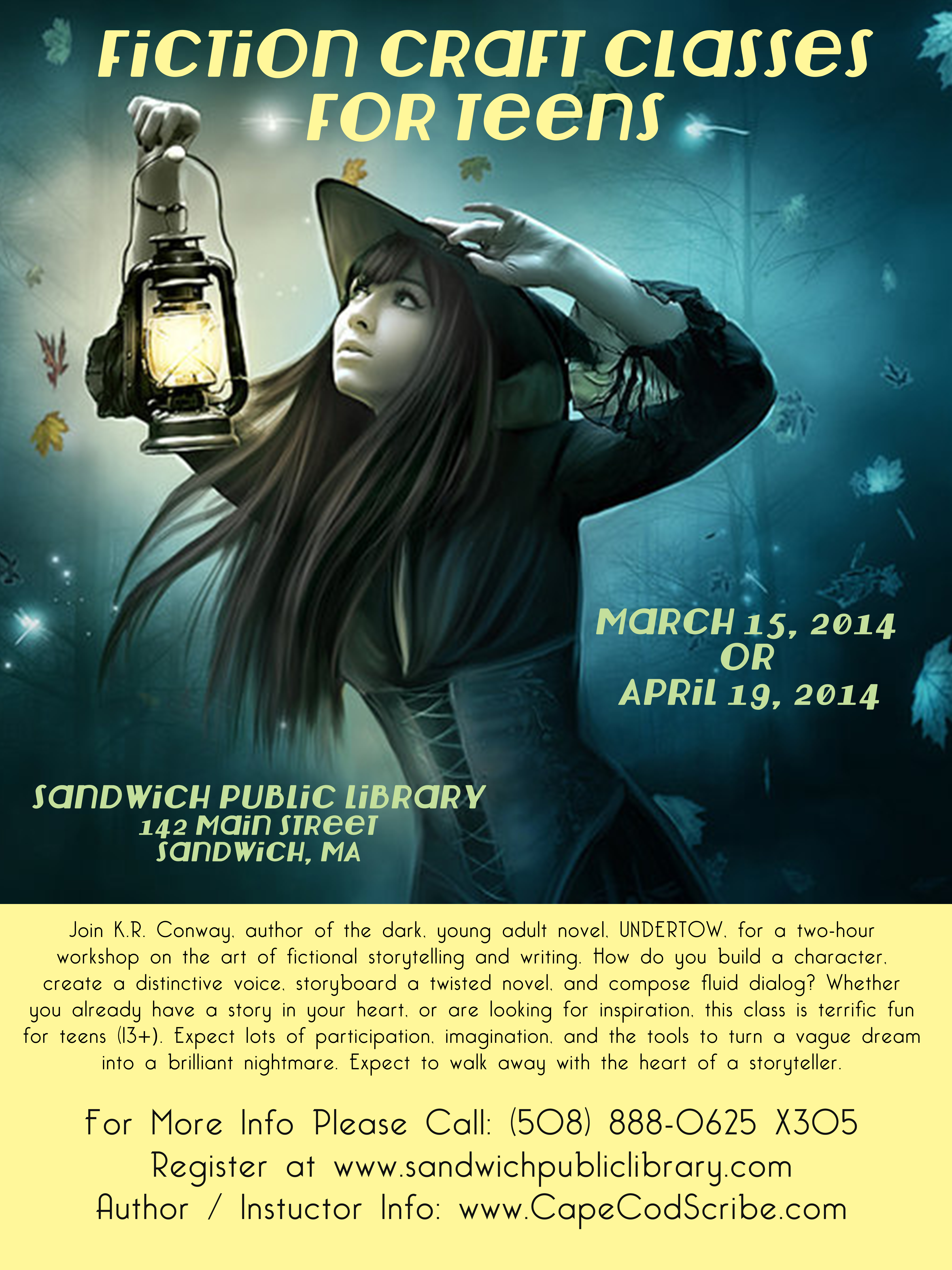 On April 19 I will be teaching a condensed form of my Fiction Craft Class for Teens at the Sandwich Library – sign up early through the library website, as the classes are usually packed.
